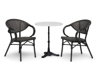 Stylish stackable coffee chair in brown aluminum and braided wicker in the seat and the back in textilene.