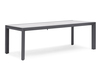 A practical dining table that measures 220 cm and is easily extended to 340 cm with an accessory extension top. Made of aluminum. Color: Charcoal. Ceramic glass table top.