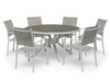 Hånger dining set is one of our most popular series – a stylish and easy-care solution for your outdoor space, requiring minimal maintenance. The table measures 140 cm in diameter and features a white aluminum frame with an elegant warm grey ceramic glass top. The stackable chairs in white aluminum with greybeige textilene combine comfort with practical functionality. Perfect for social summer gatherings.