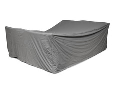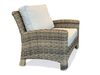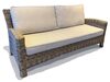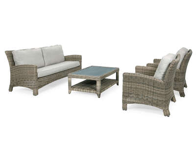 An exclusive group made of natural-colored artificial rattan. Table top in tempered glass that has been spray-treated for a stone-like appearance. Gray braun cushion in olefin.