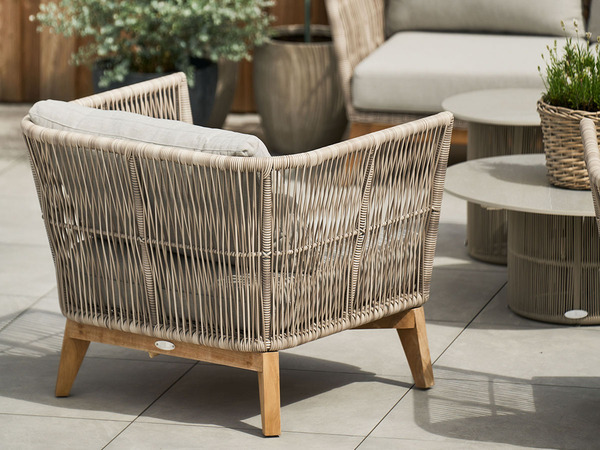 A stylish 3-seater sofa made of teak and beige wicker strips. Beige Sunproof® cushion in olefine included. Removable cover, hand wash.