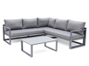 A smaller group with clean lines. The sofa has a height-adjustable part for maximum comfort. Made of anthracite grey aluminum. Grey cushion in polyester. Table top in colored glass. 3-sits 212x70x85 cm, 2-sits 142x70x5 cm, Bord 88x60x 35 cm.