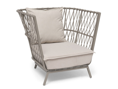 Jet Set divan is made of beige aluminum and beige braided UV fabric stripes. A beige cushion in polyester is also included. Jet Set is designed by Karl Malmvall.