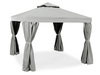 The Luxor Pavilion features a dark brown metal frame, with a roof and walls made of sand-colored polyester fabric, weighing 220 grams. The pavilion is sold as a sunshade and comes complete with a roof, side walls, and a mosquito net. Metal stakes are included to anchor the pavilion to the lawn. The mosquito net and side walls can be used separately. You can have both the mosquito net and/or side walls on one or more sides of the pavilion, while leaving the other sides completely open. A centered hook on the underside of the roof is perfect for hanging lights or other decorations. The upper roof section (80x80 cm) allows for ventilation, making it easier for air to flow through the pavilion.