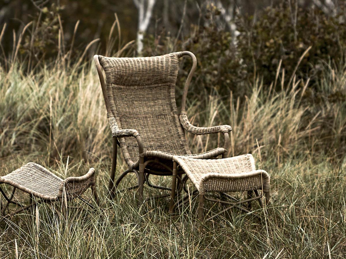Praktö is a piece of furniture designed for rest and recreation. The recliner is made of natural rattan and is ergonomically designed for maximum comfort. With the feet on the footstool it is possible to stretch out properly.