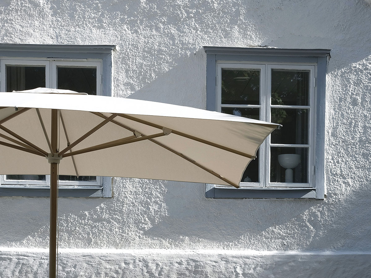 An exclusive 290x290 centimeter square parasol made from solid materials known for their high quality. It is crafted from aluminum with a wood-look finish and features olefin fabric. The pole has a diameter of 48 mm.