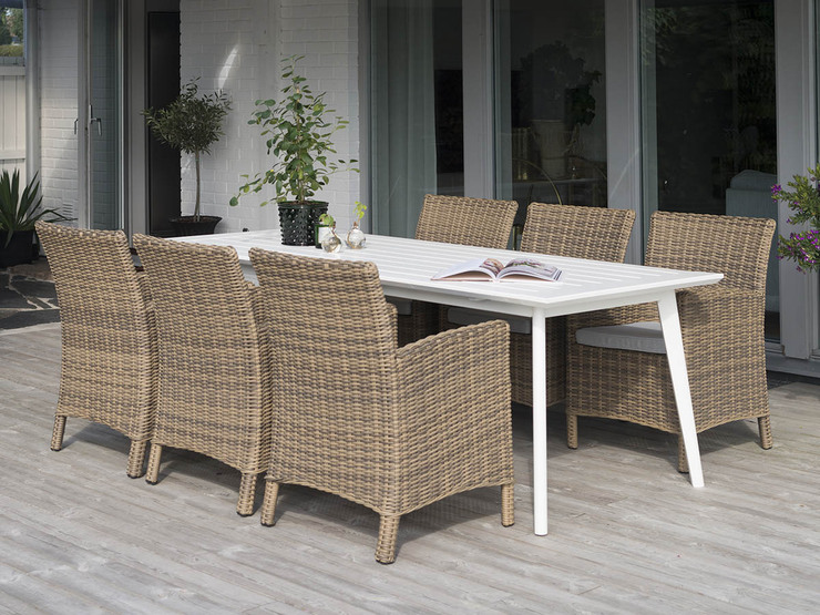 As for Dallas, the profile of the fiber of the wicker is circular. It gives an unmistakable character to the furniture and the design is one of the most exclusive on the market. Quató™-wicker woven around an aluminum frame guarantees high quality. The Dallas table has a hardened glass top, which has been Spraystone™-treated to look and feel like stone. Nice and practical!