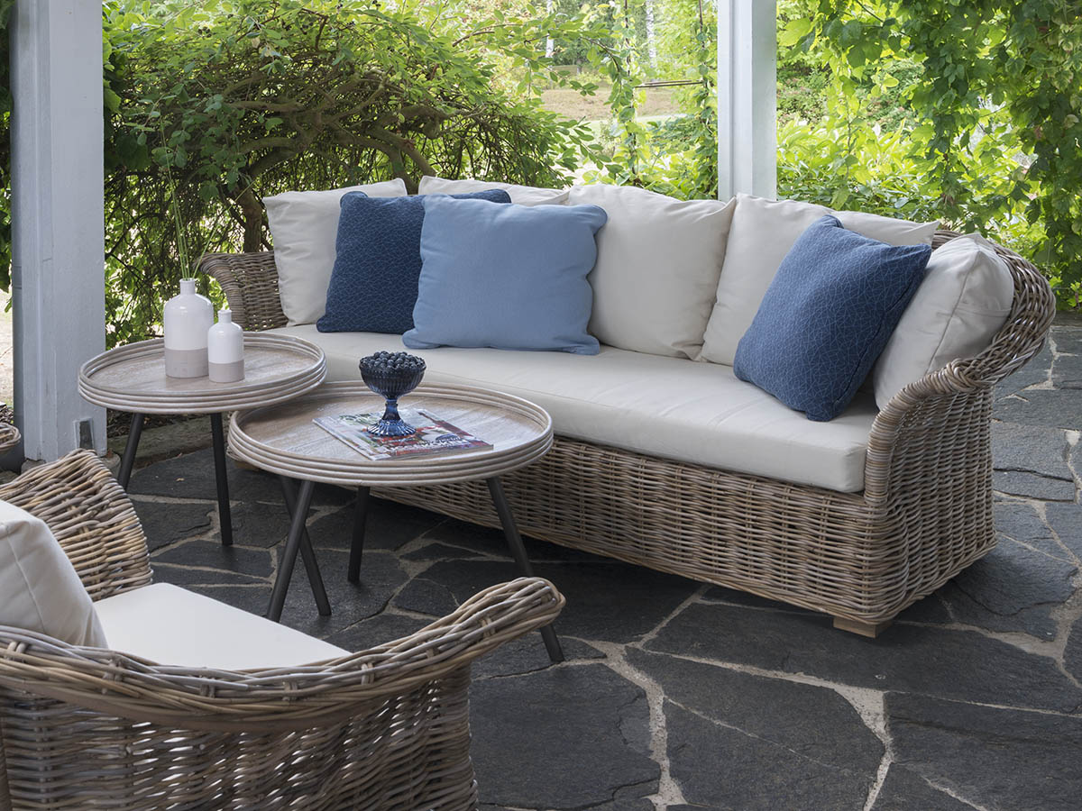 Sofa made of natural rattan that fits well in indoor environments. With its round shapes, Edsklinta creates a beautiful and wonderful feeling. White cushions are included.