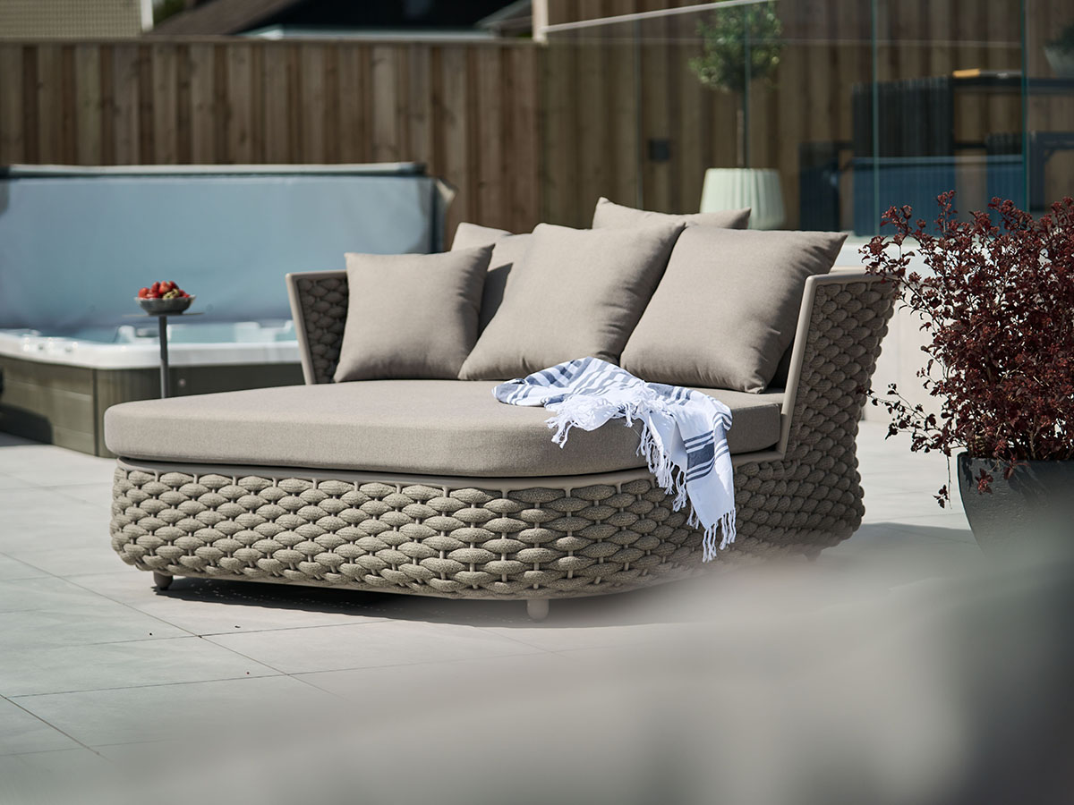A luxurious and sophisticated daybed for a comfortable outdoor life. Made of aluminum with acrylic yard in taupe. The daybed can be easily moved with the help of a wheeled device. Acrylic fabric cushions that are water-repellent and resistant to stains. UV resistance 6-7/8. The cushions have removable upholstery and can be washed at 40 degrees. Custom-made polyester furniture cover included.