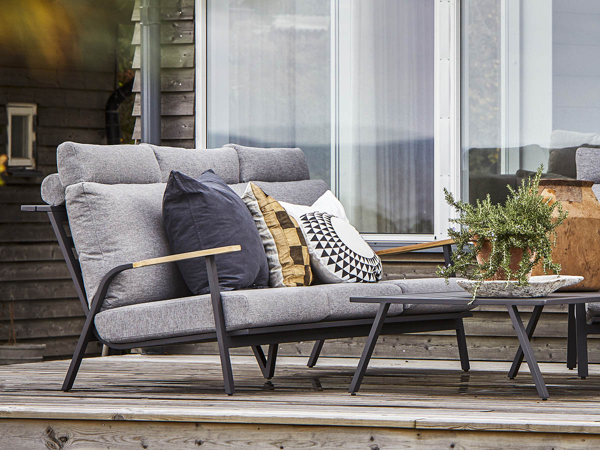 A functional and beautifully designed 3-seater sofa. Made of aluminum with wooden details in FSC®-certified teak. Color: charcoal. Grey cushion and neck pillow in olefin with quickdry foam in the seat. Quickdry is an unique foam with fast drying ability and high comfort. Quickdry is breathable, has an open cell structure and it's weather resistant. Therefore, it works optimally for outdoor furniture.