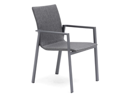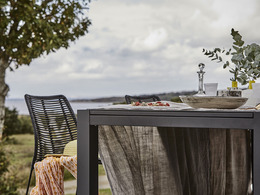 Flexible furniture serie with chairs and tables. The table has a practical extension top that increases the table area from 220 cm to a total of 340 cm. Made of aluminum in the color of charcoal. Laminated glass table top. Stackable chairs in grey upholstered fabric, which does not require an extra cushion. The textile is an easy-care and quick-drying material.