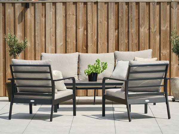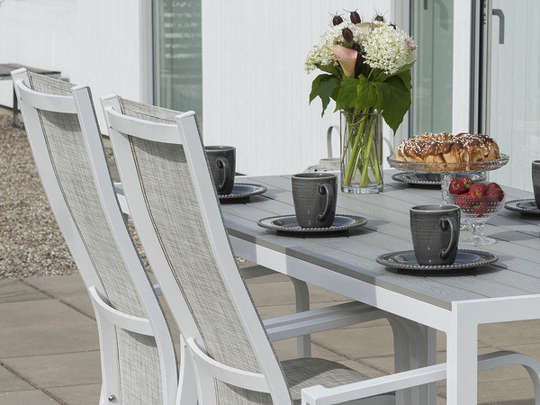 Skapa en fin helhet i trädgården, på altanen eller i uterummet med Hånger. En stilren och lättskött möbelserie i aluminium med detaljer i textilen och keramisk glasskiva.  Hånger finns både som mat- och loungemöbler.