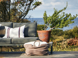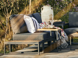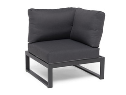 En bekväm och modulär möbelserie med flera element som kan kombineras. Soffan är höj- och sänkbar i båda ändar för högsta komfort. Serien är tillverkad i aluminium i färgnyansen charcoal. Bordsskivor i FSC-certifierad teak. Ljusgrå dynor i polyester med quickdry foam i sitsen. Quickdry är ett unikt fyllnadsmaterial med snabb upptorkningsförmåga och god sittkomfort. Det är andningsbart, har öppen cellstruktur och är väderbeständigt och fungerar därför optimalt för utomhusmöbler.