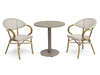 Smakfullt nätt cafeset i modern, harmonisk och jordnära sandfärgad/beige kulör. Lättskött och praktiskt cafeset som passar lika bra på din uteplats, balkongen eller som favorithörna i trädgården. Bord tillverkat i pulverlackad stål. Bordet har en stabil fot som gör att bordet står stadigt, samt ställbara fötter så du kan anpassa dina möbler efter ojämna ytor. Stilfull stapelbar caféstol i ljusbrun aluminium med sits- och rygg i flätad textilen.