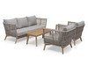 En stilfull och modern soffgrupp tillverkad i beige konstrottingband. Banden är på en stomme av aluminium och stolens trädetaljer samt bord är i teak. Beige dynor i sunproof-material som är ett väderbeständigt och UV-resistent premiumtyg i olefin. Avtagbar klädsel, handtvätt.