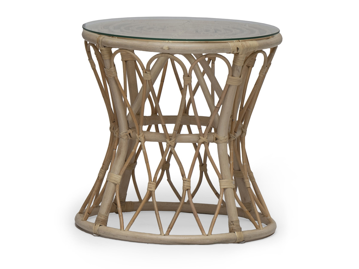 Sidobord i naturrotting med bordsskiva i glas. Möbeln är lämpad för inomhusmiljöer.