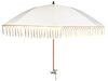 Charmigt och smidigt balkongparasoll med fransar som skyddar mot solens strålar. Tillverkad i pulverlackad stål och beige polyester 120 gram. Stången mäter Ø14 mm. Balkongfäste ingår. Säljs i ett 6-pack.