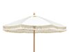 Smakfullt parasoll som ramar in din uteplats och skänker vila från solens strålar en solig sommardag. Idealisk för varma och soliga sommardagar. Tillverkad i aluminium med trä-look och tyg i beige solution dyed polyester, 250 gram med fransar i bomull. Stången mäter Ø48 mm.