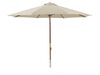 Träparasoll med beige tyg. Lyxutförande, hela 330 cm stort. Stång i trä (diameter 48 mm) och tyg av polyester. Smidig fällningsmekanism gör parasollet enkelt att fälla upp och fälla ned. Parasollfot ingår ej!