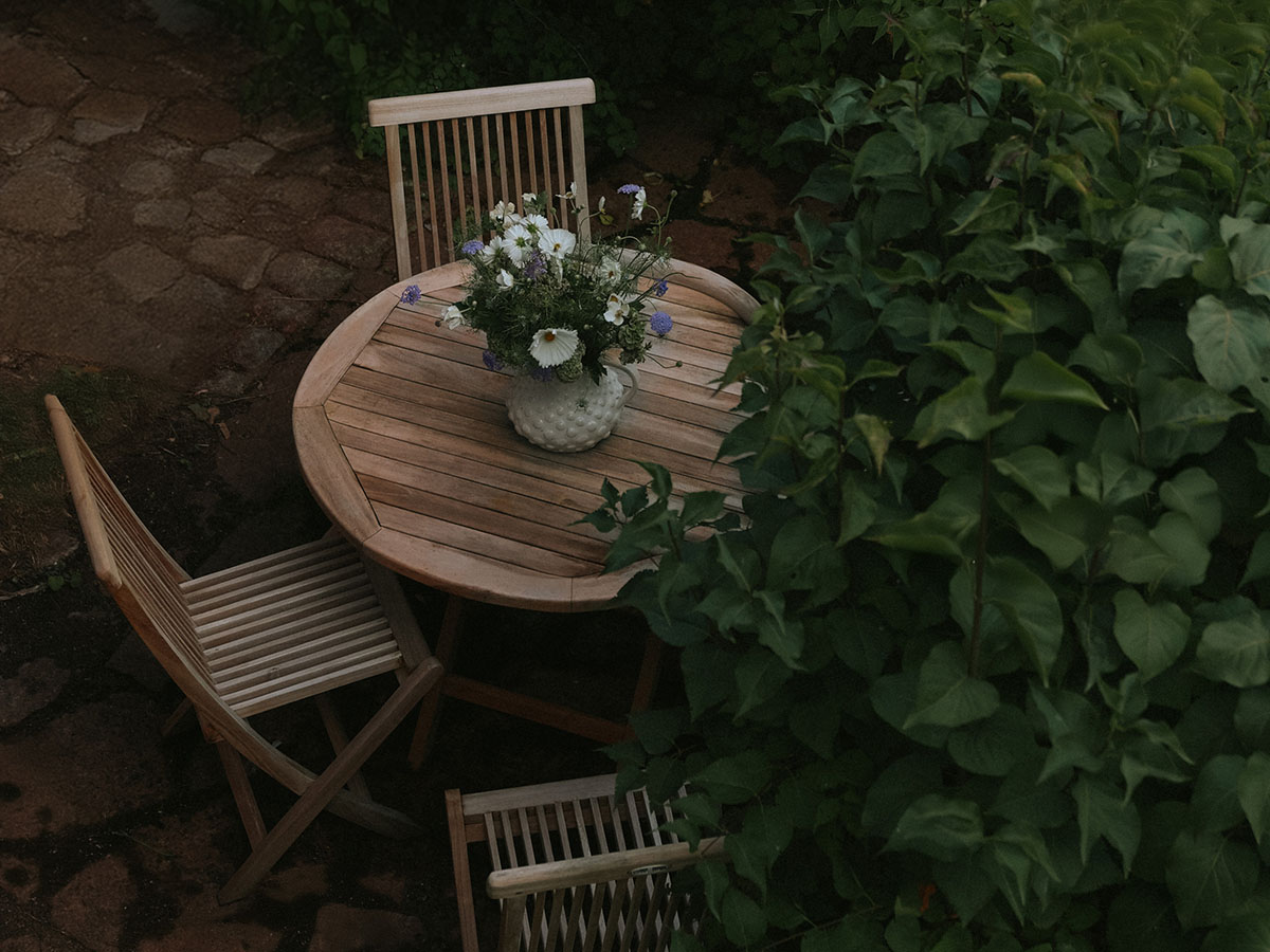 Klassisk möbel i obehandlad teak. Bord och stol går enkelt att fälla för smidig förvaring. Tillverkad i teak av hög kvalitet, FLEGT-certifierad.