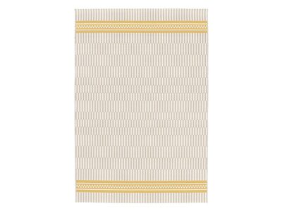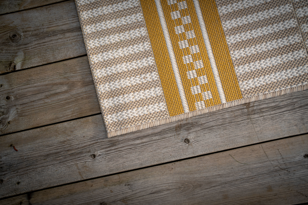 Mönstrad utomhusmatta i modernt uttryck med en mönsterdetalj i kontrasterade gul färg. Väven har en slät struktur med ett tåligt avskalat uttryck. Tillverkad av 100% extra hållbart polypropylengarn. Garnet är UV-beständigt, tål vatten, fäller inte, och är fläckavvisande. Mattan kan därför utan problem placeras utomhus, i uterum eller inomhus. Långsidorna är avslutade med tålig langett i matchande färg och kortsidorna är limmade och nedvikta för att ge en slimmad siluett. Lätt att rengöra, dammsug eller spola av med ljummet vatten och låt torka. Fläckar avlägsnas med en svamp, lite ljummet vatten och diskmedel. Finns i flera olika storlekar.