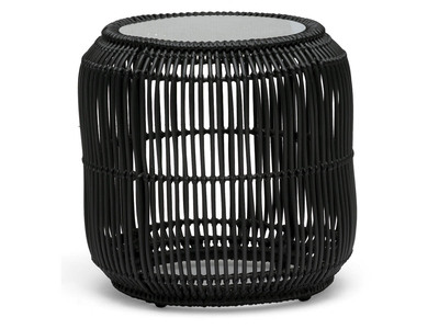 Modernt rundat bord i svart konstrotting och svart aluminiumstomme med bordsskiva i glas. Edanäs passar utmärkt för det lilla utrymmet.