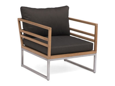 En fåtölj i aluminium och teak. Med sina raka linjer och moderna formspråk ger denna serie ett kaxigt och elegant uttryck. Mörkgrå sunproof dyna ingår. Dynan är tillverkad i 100% olefin och är ett väderbeständigt och UV-resistent premiumtyg.