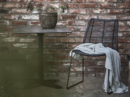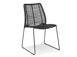 En modern och retro stol för inomhusmiljö. Stolen är gjord i naturfärgad naturrotting och svart metallstomme, och är även stapelbar.
