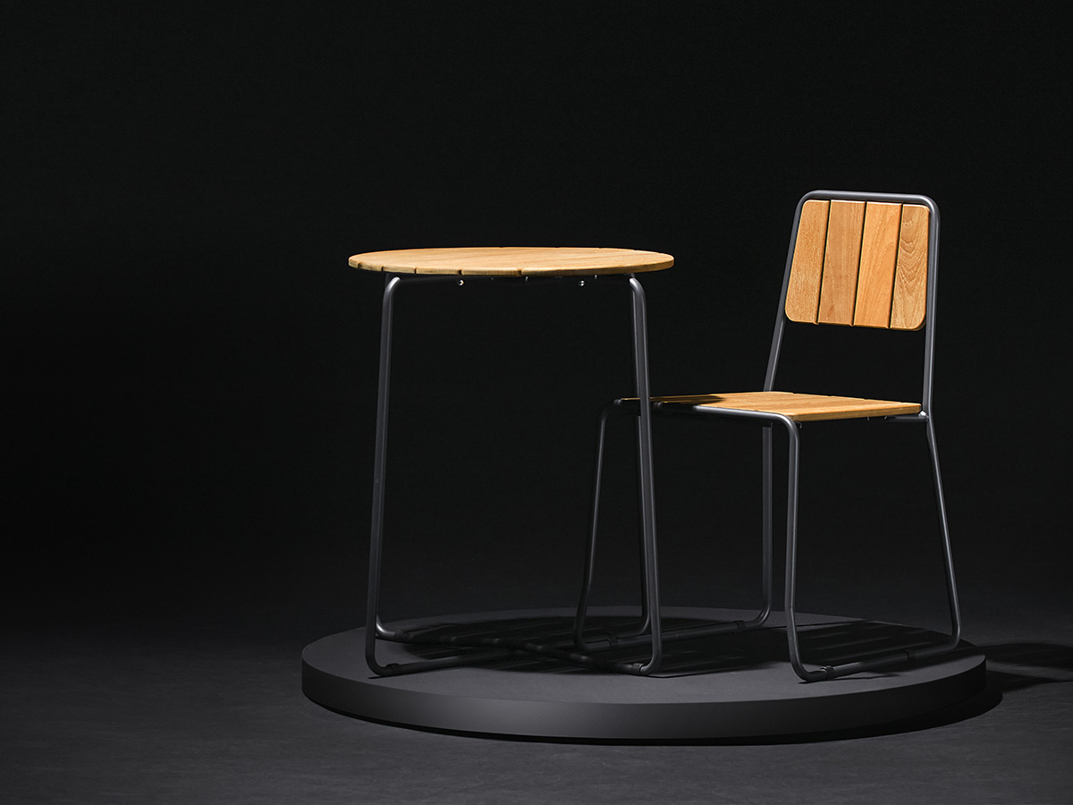 En tidlös och nätt möbel som passar lika bra på den lilla stadsbalkongen som i den gröna trädgården. Bordsskiva mäter 56 cm i diameter. Tillverkad i obehandlad teak med orkangrå pulverlackad stålstomme. Serien är formgiven av möbeldesignern Sebastian Hedengrahn.