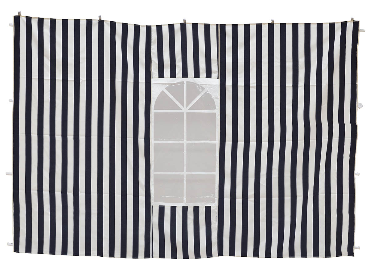 Blå/vit randiga allroundväggar i PE. Säljes i 2-pack, en vägg med fönster och en utan fönster. Kardborreband för upphängning.