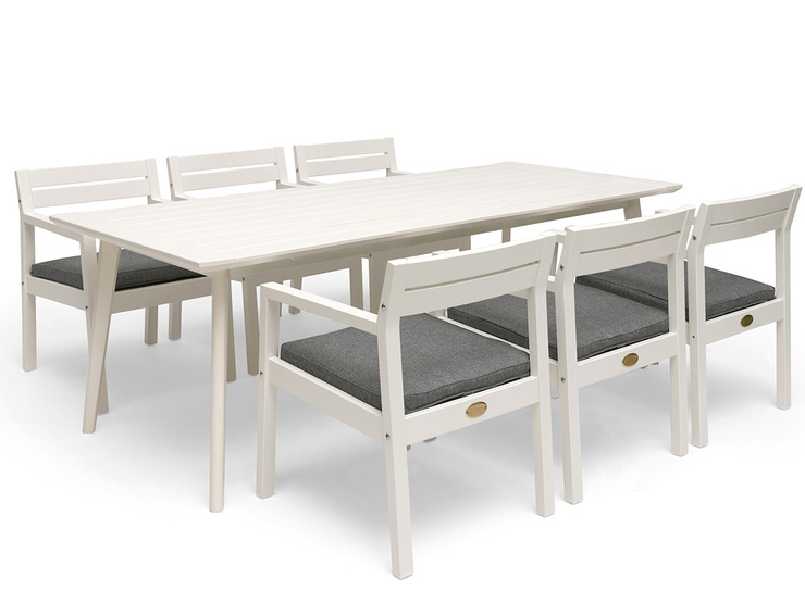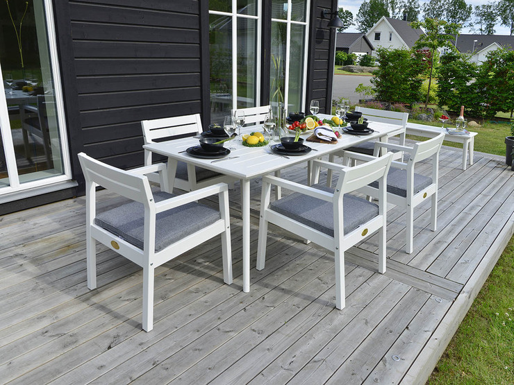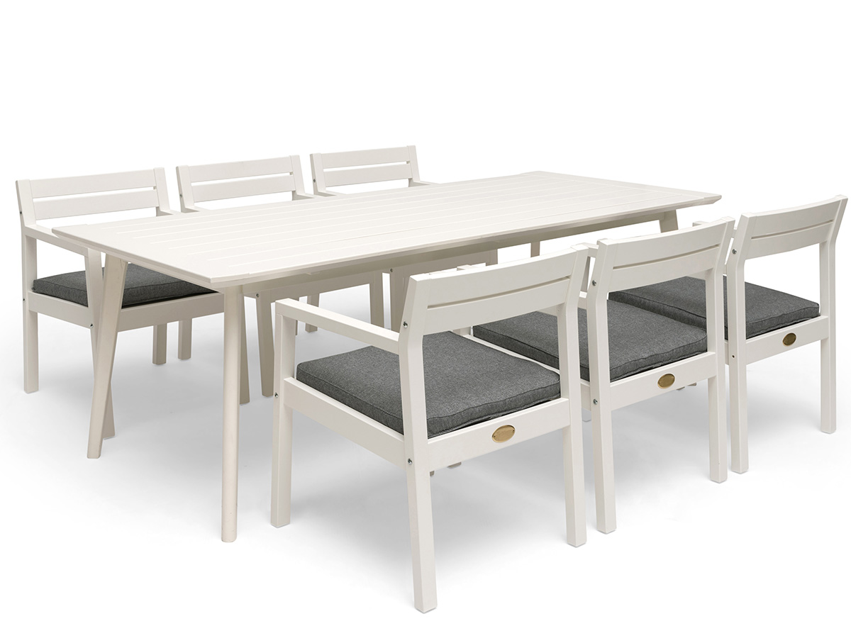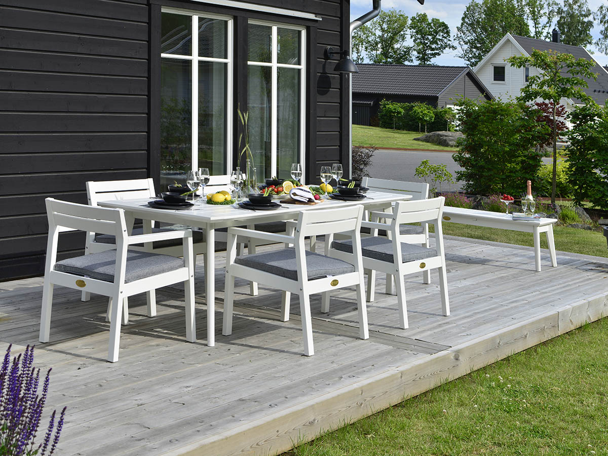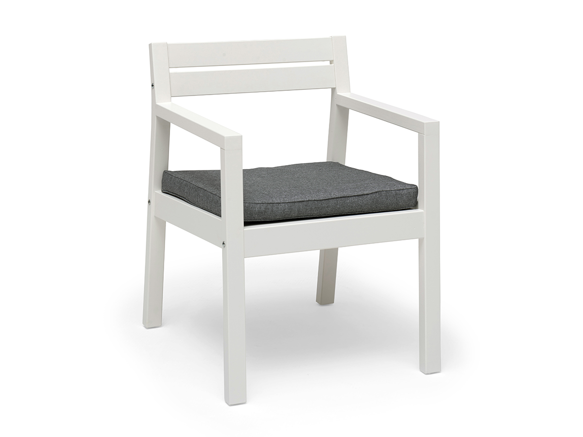 En stilsäker matstol som kännetecknas av sina raka linjer och moderna design. Tillverkad i vitlackad FSC®-märkt kärnfuru. Grå melange dyna ingår!