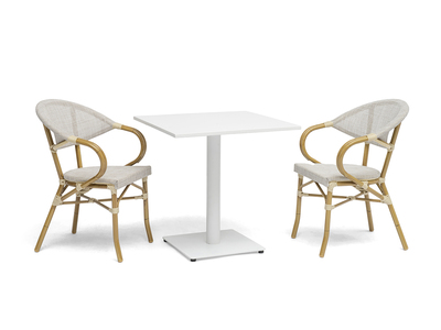 Smakfullt nätt cafeset i modern, harmonisk och jordnära beige kulör. Lättskött och praktiskt cafeset som passar lika bra på din uteplats, balkongen eller som favorithörna i trädgården. Bord tillverkat i pulverlackad stål. Bordet har en stabil fot som gör att bordet står stadigt, samt ställbara fötter så du kan anpassa dina möbler efter ojämna ytor. Stilfull stapelbar caféstol i ljusbrun aluminium med sits- och rygg i flätad textilen.