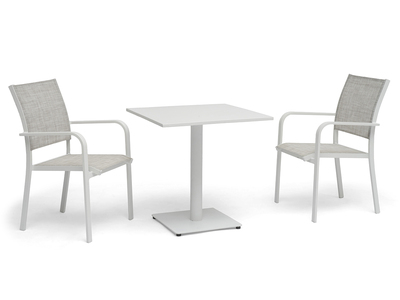 Lättskött och praktiskt cafeset som passar lika bra på din uteplats, balkongen eller som favorithörna i trädgården. Bord tillverkat i pulverlackad stål. Bordet har en stabil fot som gör att bordet står stadigt, samt ställbara fötter så du kan anpassa dina möbler efter ojämna ytor. Stapelbar stol i vit aluminium med sits- och rygg i flätad textilen.