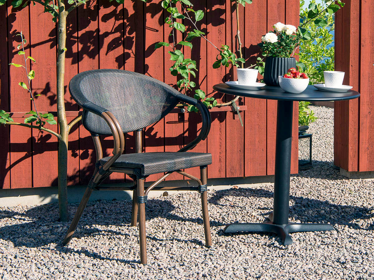 Utöver klassiska cafégrupper i trä erbjuder vi också klädda caféstolar och cafébord i stål. Ett alternativ för dig som söker något mer modernistiskt. Caféstolen Äppelhed är tillverkad av aluminium och flätad textil, redo för många stunder av njutning i trädgården.
