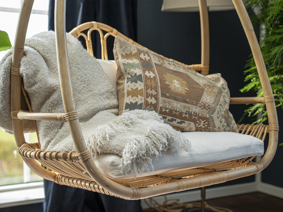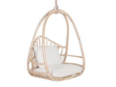 Alva är en smakfull hängkorg i ljus naturrotting som kombinerar trend och charm i en inbjudande helhet. Den mjuka dynan i creméfärgad polyester/bomull ger hög komfort och gör stolen till en favoritplats för vila och njutning.