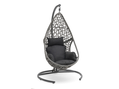 Droppen är en trendig och bekväm hängstol i grå rotting med en tillhörande ställning i svart metall.