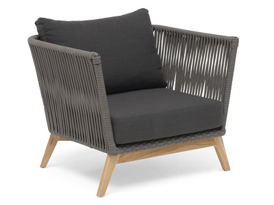 En stilfull och modern loungefåtölj i mörkgrå tygband med UV-skydd. Banden är på en stomme av aluminium och stolens trädetaljer är i teak. Mörkgrå sunproof dyna tillverkad i 100% olefin ingår. Sunproof är ett väderbeständigt och UV-resistent premiumtyg. Avtagbar klädsel, handtvätt.