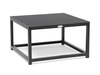 Lågt bord med benställning i svart metall och bordsskiva i keramiskt glas.