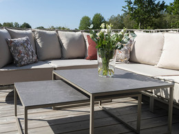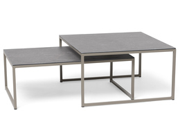 Satsbord med benställning i svart metall och bordsskiva i grå keramiskt glas. Mått: Högt bord 80x80x44 cm, lågt bord 100x60x36 cm.