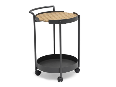 En praktisk och snygg serveringsvagn i Lindeby-serien som på ett smakfullt sätt kan matchas med dina övriga teakmöbler. Passar bland annat till Skagenäs, Oxhult och Kungshult. Tillverkad i antracitgrå aluminium och obehandlad teak. Den översta skivan är en avtagbar bricka.