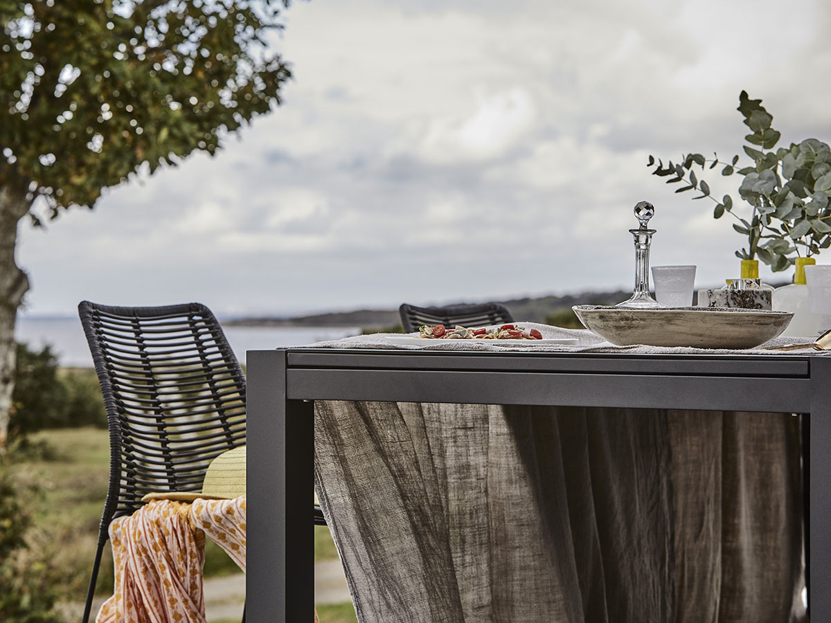 Ett praktiskt matbord som mäter 220 cm och som enkelt förlängs till 340 cm med tillhörande iläggsskiva. Tillverkad av aluminium. Färg: Charcoal. Bordsskiva av keramiskt glas