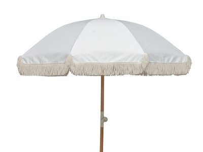 Charmigt parasoll med fransar som skapar en ombonad och hemtrevlig miljö. Här kombineras funktion med stil. Parasollet har många användningsområden, och kan med fördel användas både till balkong, strand och uteplatsen. Idealiskt för varma och soliga sommardagar. Tillverkad i hårdträ, tyg i polyester med bomullsfransar. Stången mäter Ø32 mm. Parasollet har en smart lutningsfunktion och kan fällas i flera olika lägen. Stångens botten kan enkelt skruvas ner i sanden. Köp till ett balkongfäste om du önskar placera parasollet på balkongen.