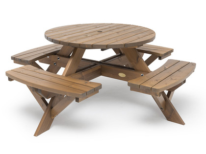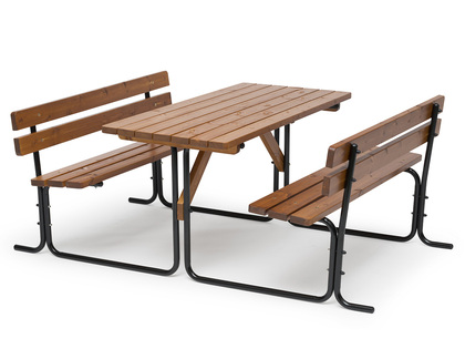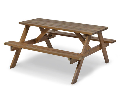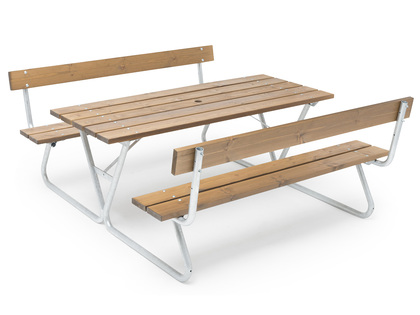 Picknickbänken kan nog sägas vara trädgårdsmöblernas svar på "oömma kläder". Rejält tilltagna virkesdimensioner, kraftiga stålrör och tänkta till uteplatsen på jobbet, golfbanan eller kanske rastplatsen.
