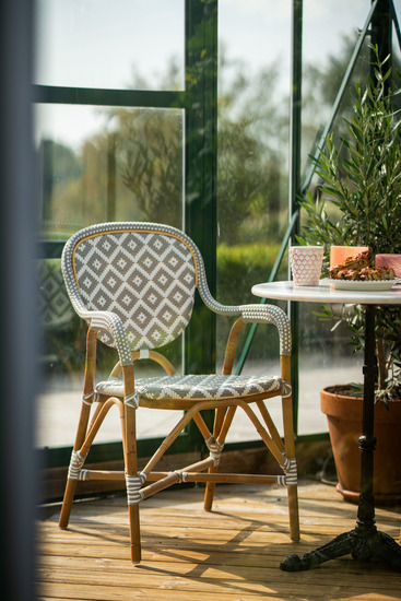 An elegant and impressive café furniture set with a lot of character. Made from genuine natural rattan with upholstered Textilene. To create a more natural style, the rattan shell has been left exposed, making it resistant to moisture. Best suited for indoor environments. It pairs beautifully with our marble tables from the Krögaren collection. The chair is sold in a set of 2.