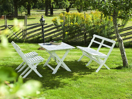 A real swedish classic. The sofa, the chair and even the table are foldable for easy winter storage. Torpet is made of FSC-certified pine. Dimensions: Sofa 126x60x82 cm, Chair 43x60x82 cm, Table 110x68x66 cm.
