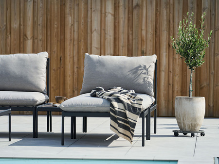 Modern, stylish, maintenance-free modular sofa. Soft round profiles meet austere design with playful modularity. Combines just the way you want with corner pieces, middle pieces, divans and tables. Made of aluminum with a table top in warm gray ceramic glass, 5mm. Clamp included for locking modules.