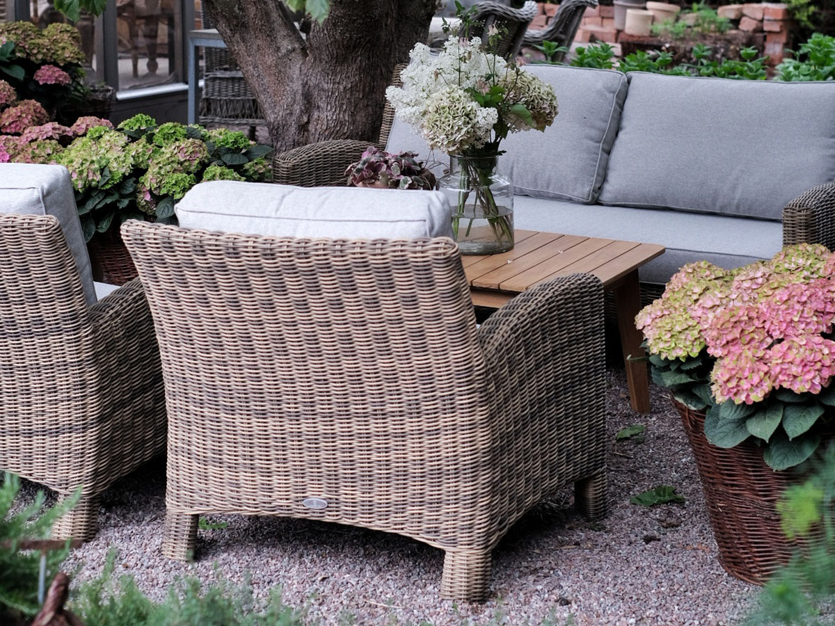 Exclusive armchair with a timeless design that gives a stylish and classic impression. Made of rounded synthetic rattan wire woven around an aluminum frame with a cushion in grey-brown olefin.