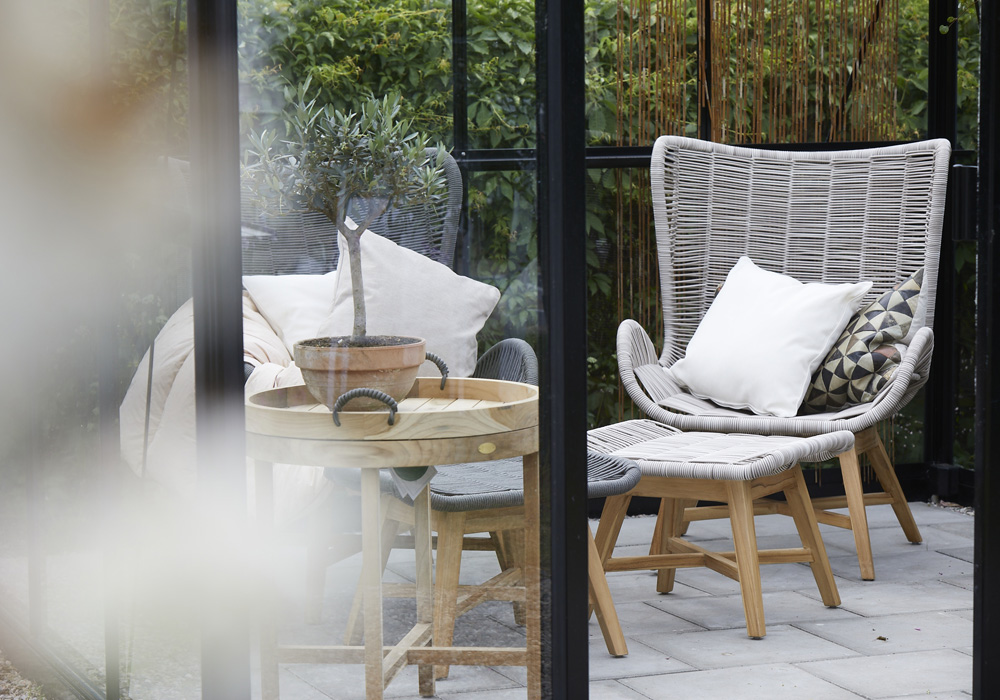 A very comfortable and beautiful recliner made of teak and grey olefine rope. Grey Sunproof® cushion in olefine included.