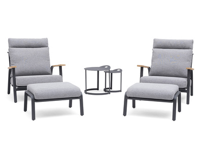 A functional and beautifully designed set. Made of aluminum with wooden details in FSC®-certified teak. Color: charcoal. Gray cushions and neck pillow in olefin with quickdry foam in the seat. Quickdry is an unique foam with fast drying ability and high comfort. Quickdry is breathable, has an open cell structure and it's weather resistant. Therefore, it works optimally for outdoor furniture.