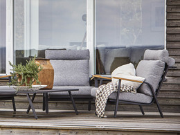 A functional and beautifully designed 3-seater sofa. Made of aluminum with wooden details in FSC®-certified teak. Color: charcoal. Grey cushion and neck pillow in olefin with quickdry foam in the seat. Quickdry is an unique foam with fast drying ability and high comfort. Quickdry is breathable, has an open cell structure and it's weather resistant. Therefore, it works optimally for outdoor furniture.